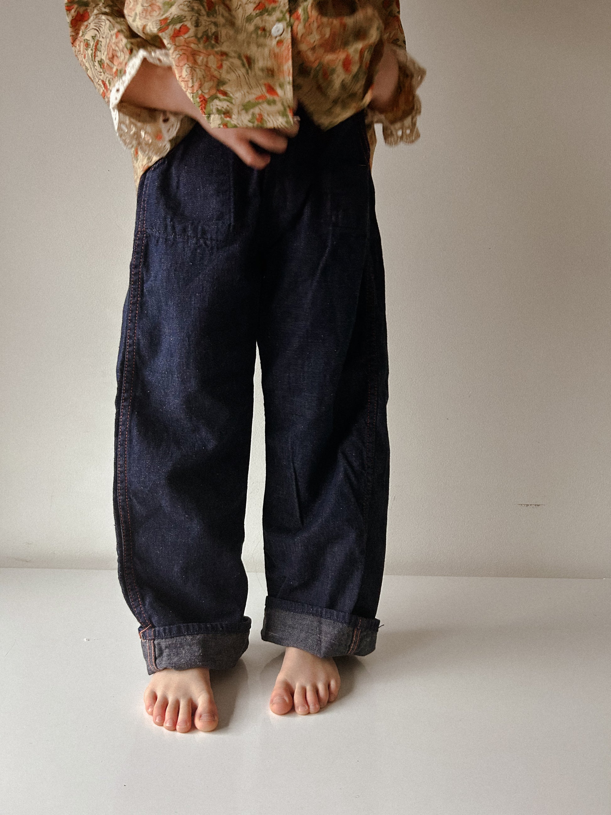 50s elastic waist jeans. These are gorgeous. Purchased as deadstock and just washed. Cute red stitch details.