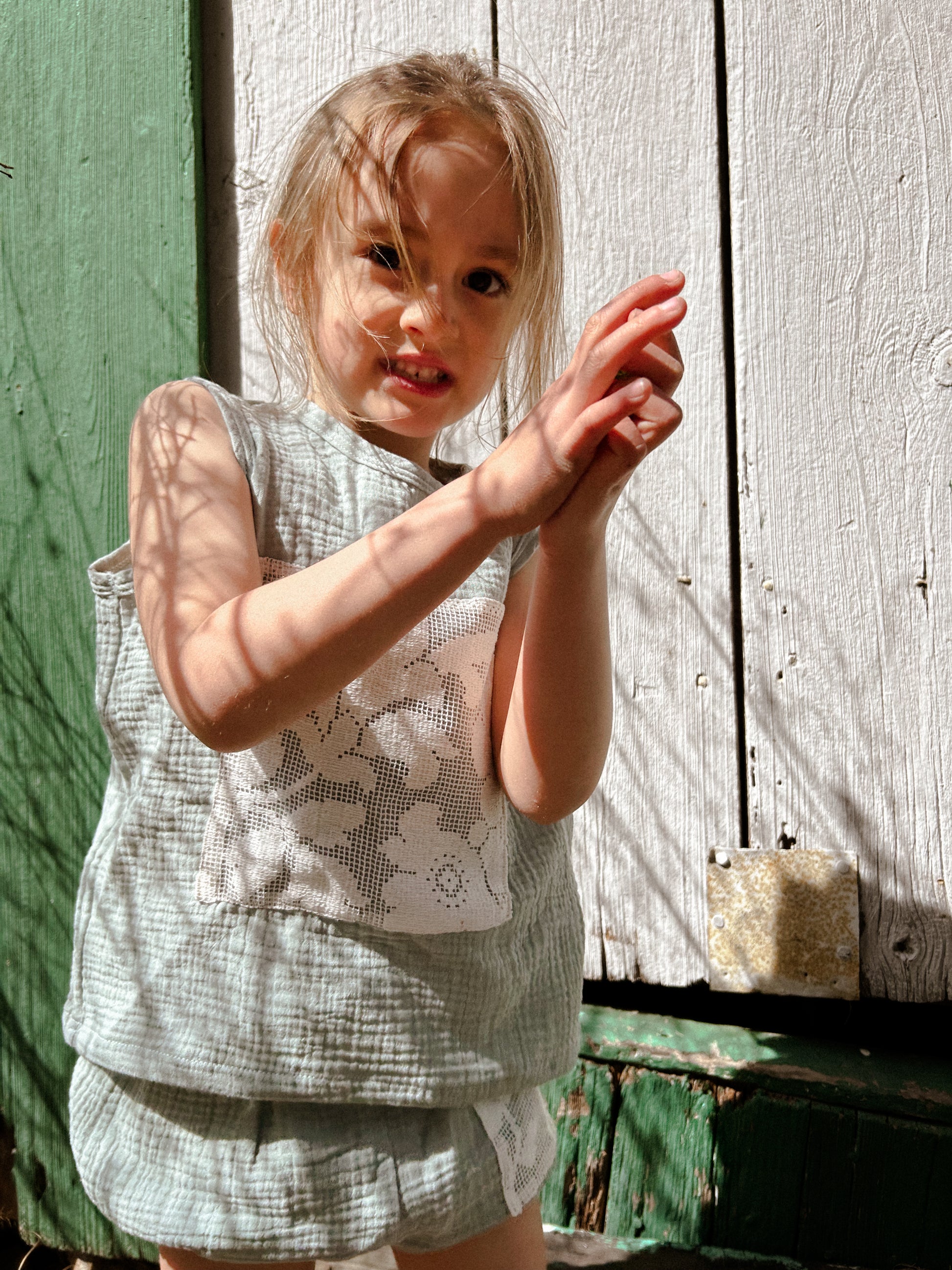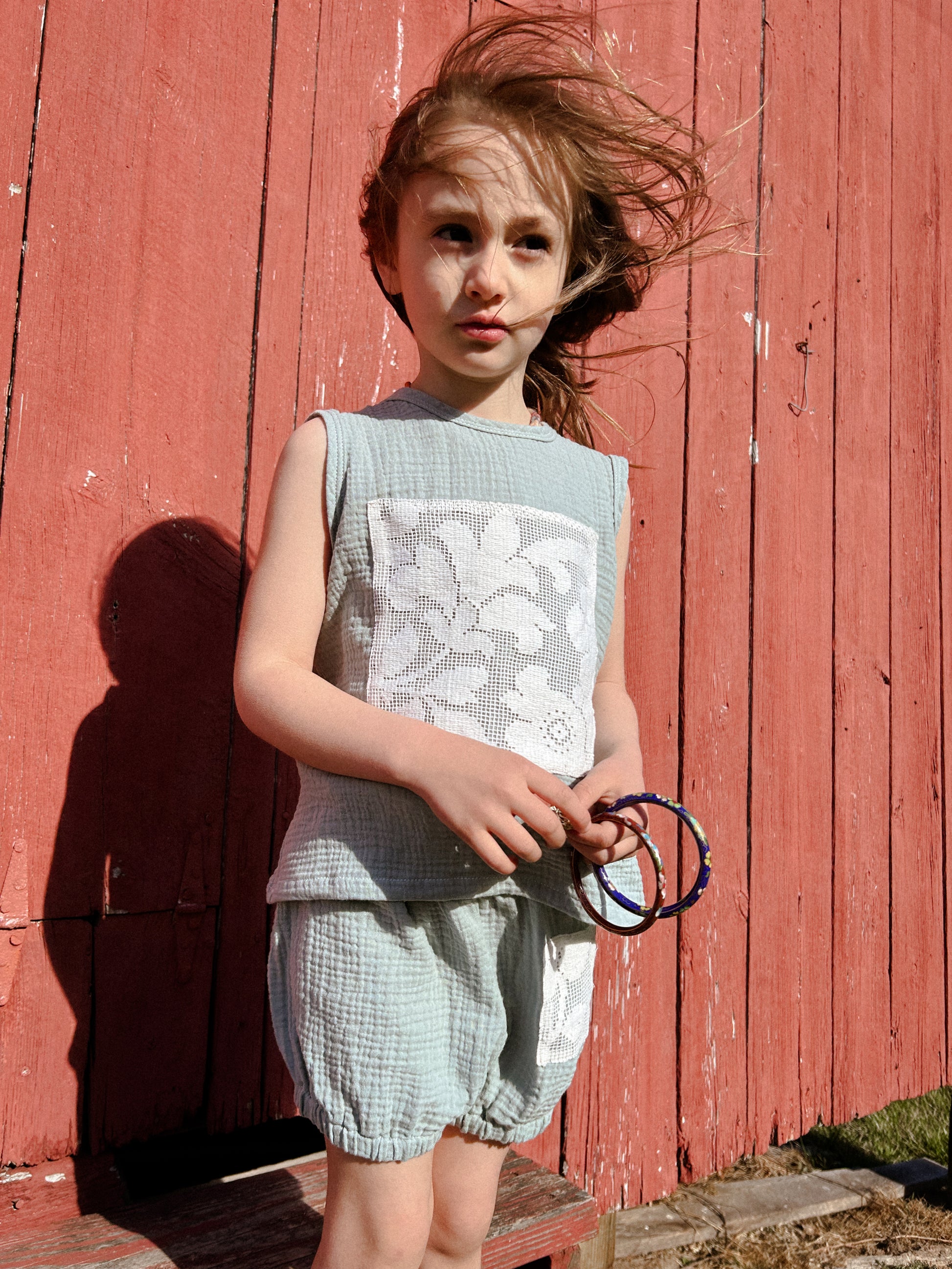Our Meadow Set in Spring is cut from the softest organic cotton. Antique cotton lace details for the sweetest touch.