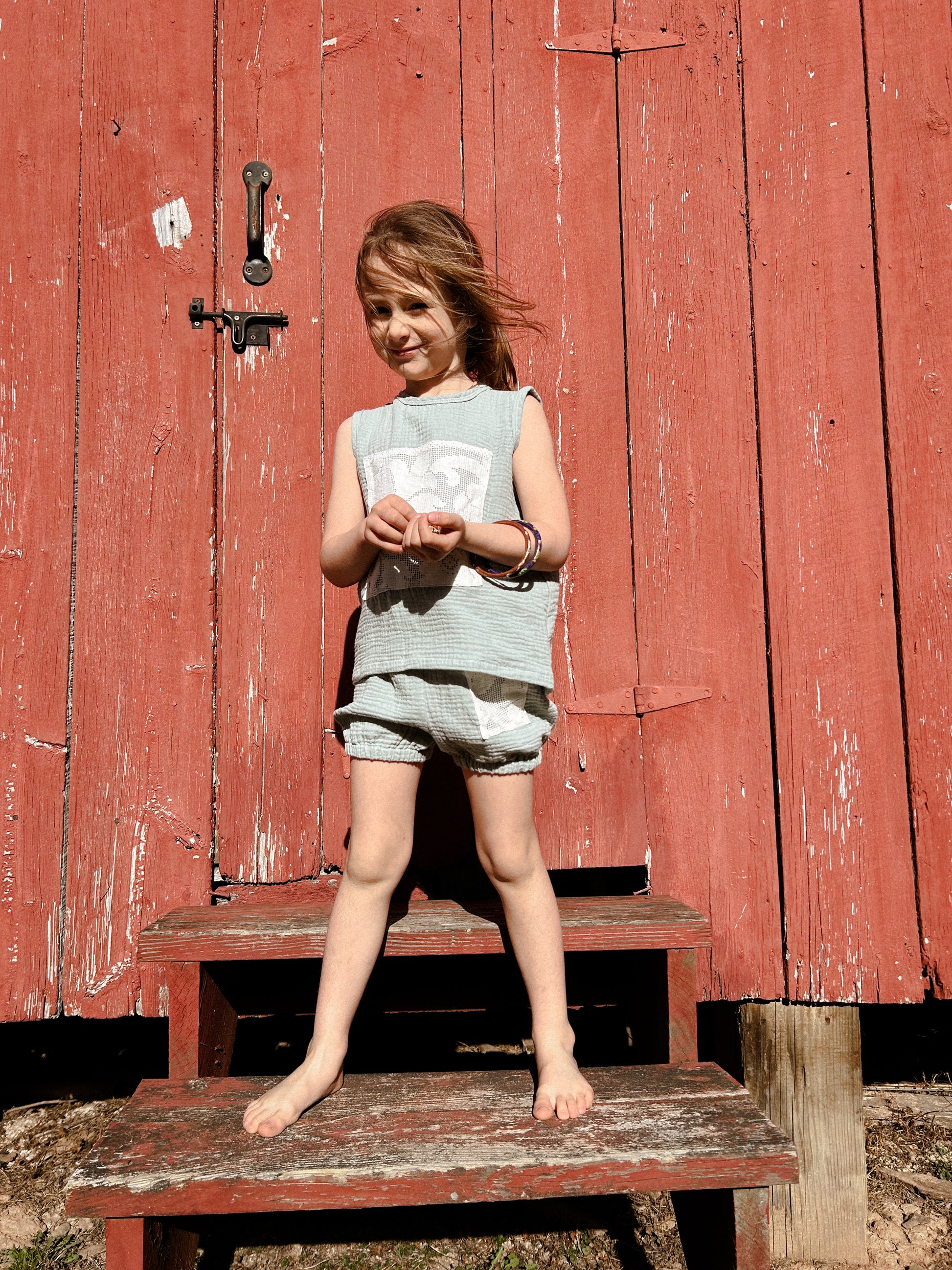 Our Meadow tank buttons down the back and bottoms have a paper bag waistband and have the perfect bubble shape.