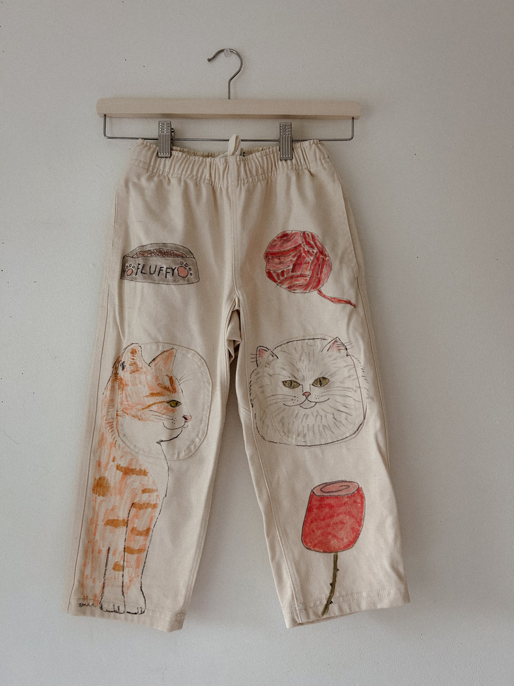 A collab featuring Sandw1tch Shop's whimsical hand drawings on our Mountain Pants with red thread! Inspired by nature, story books, and play. Katie's drawings have an immediacy and posses that undeniable need to create that comes from the core. Her drawings become an experience. Playful and open ended they give you just the beginning of a story allowing your imagination to write or draw the stories end. Hand drawn with fabric markers these drawings simply dance on our pants when worn.