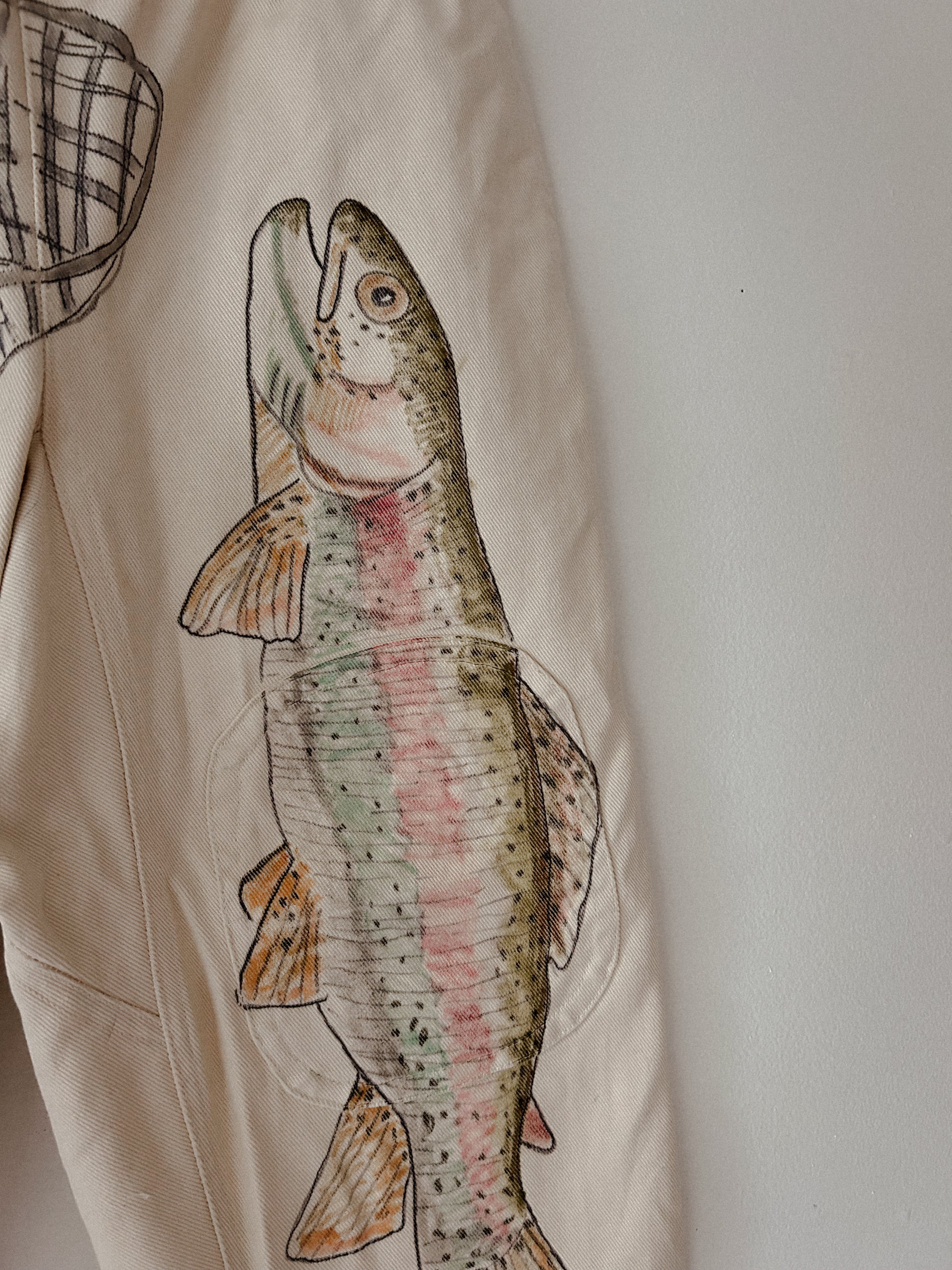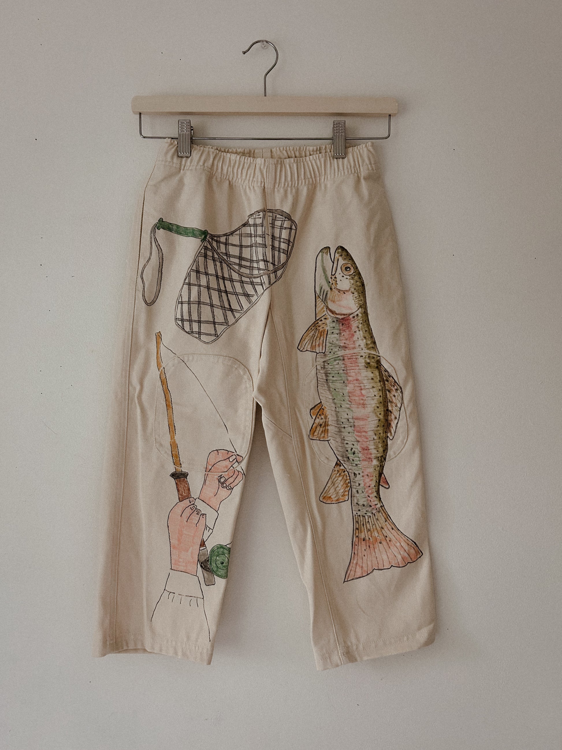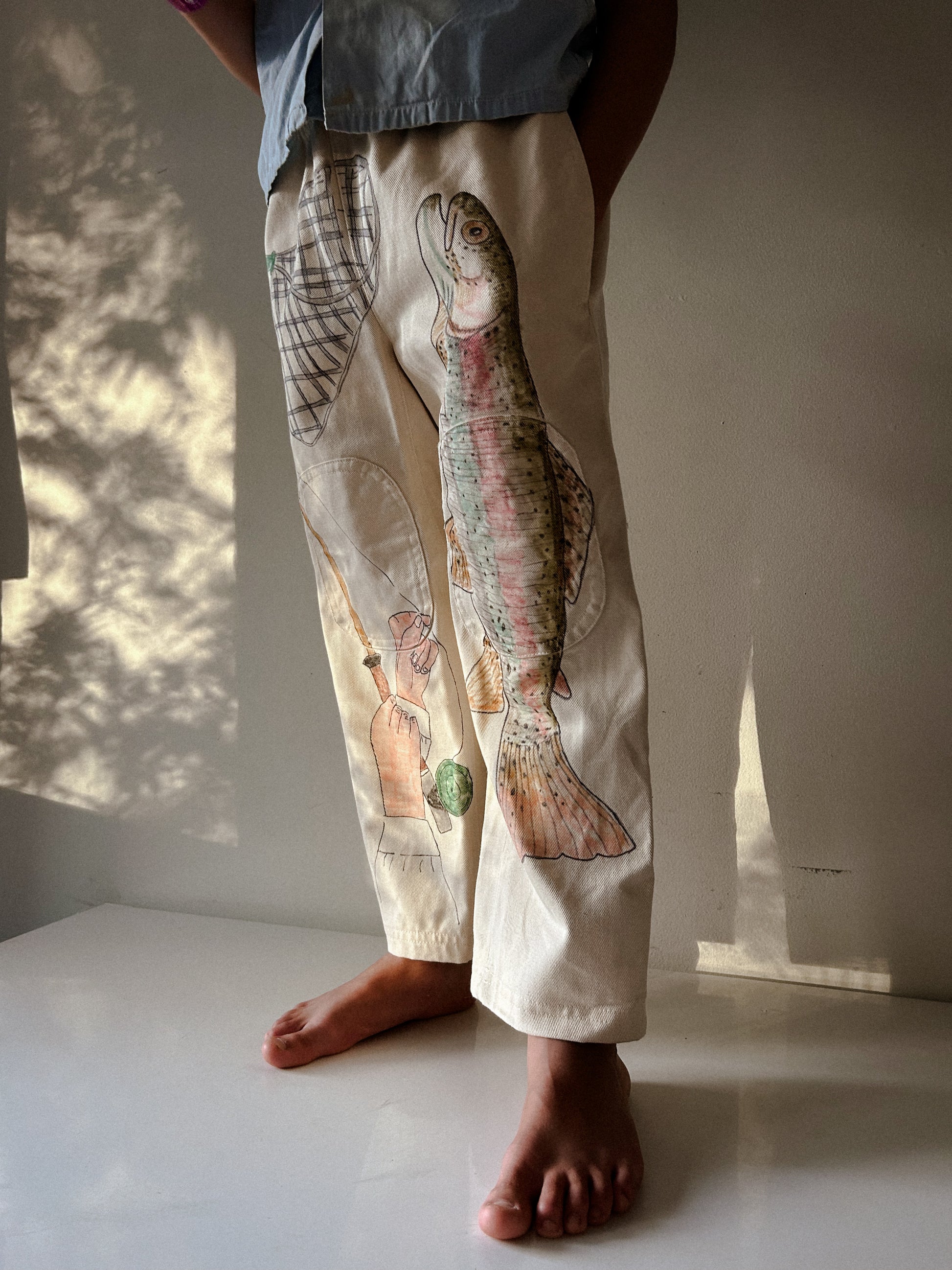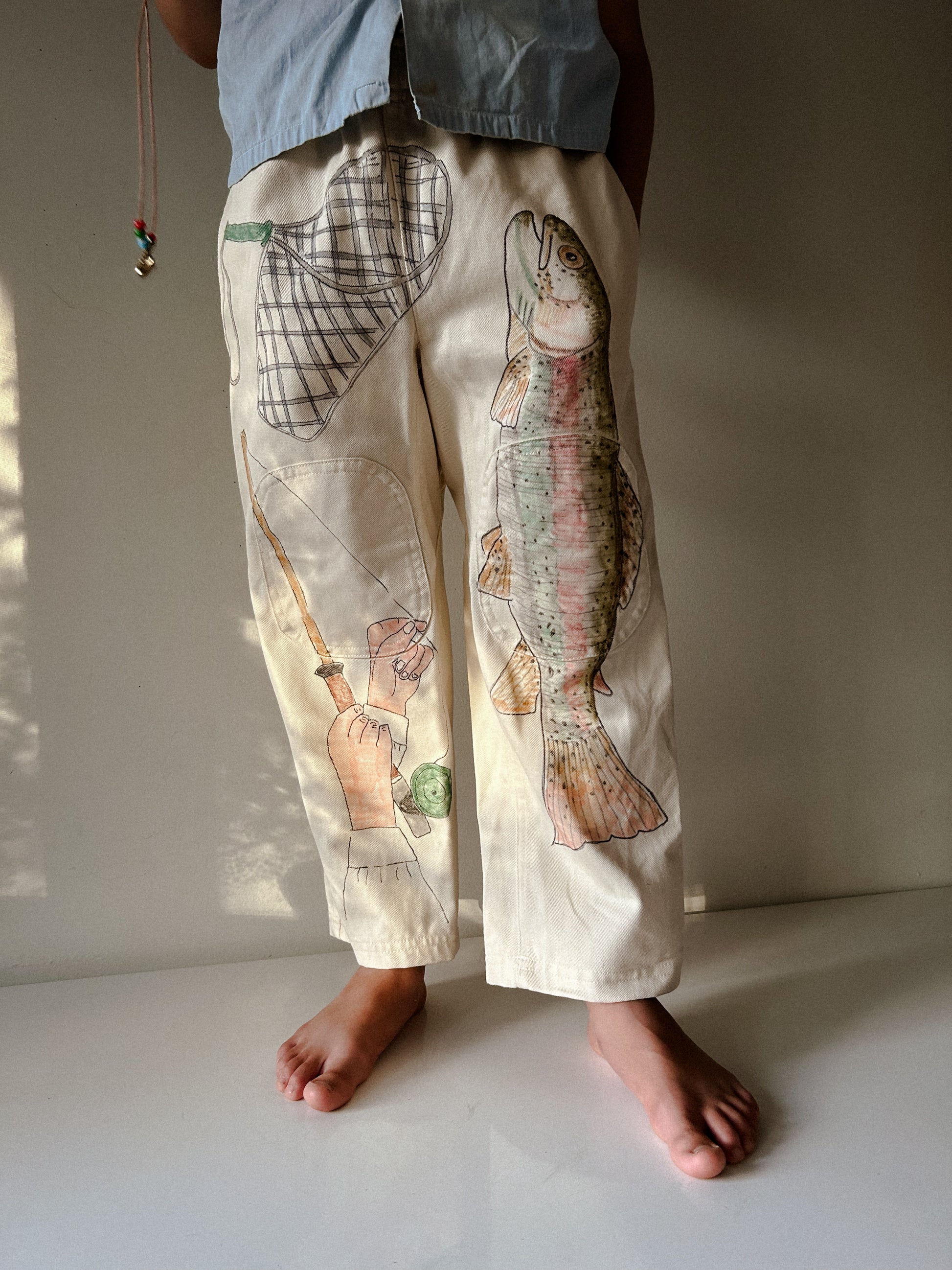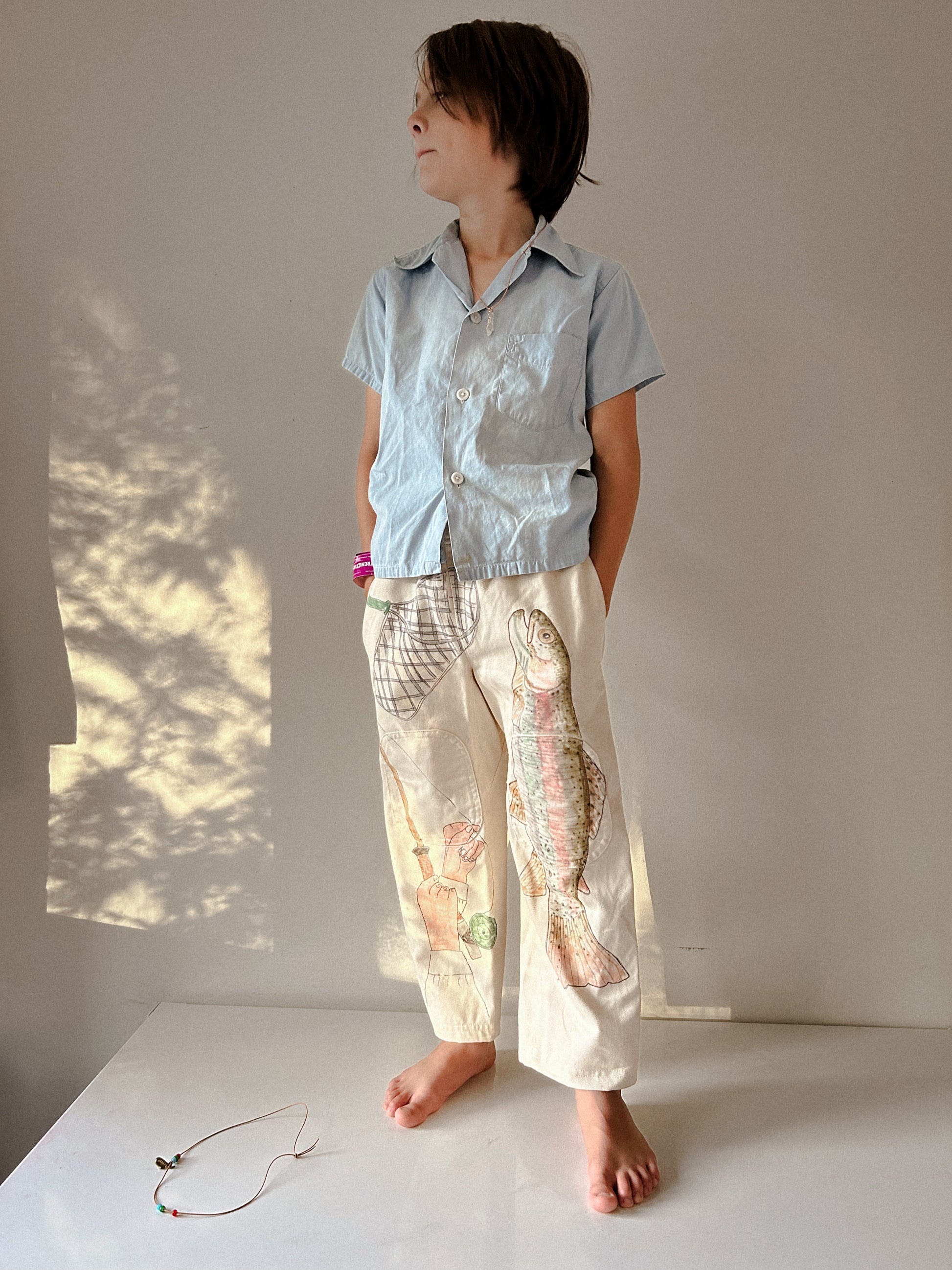 A collab featuring Sandw1tch Shop's whimsical hand drawings on our Mountain Pants with red thread! Inspired by nature, story books, and play. Katie's drawings have an immediacy and posses that undeniable need to create that comes from the core. Her drawings become an experience. Playful and open ended they give you just the beginning of a story allowing your imagination to write or draw the stories end. Hand drawn with fabric markers these drawings simply dance on our pants when worn.