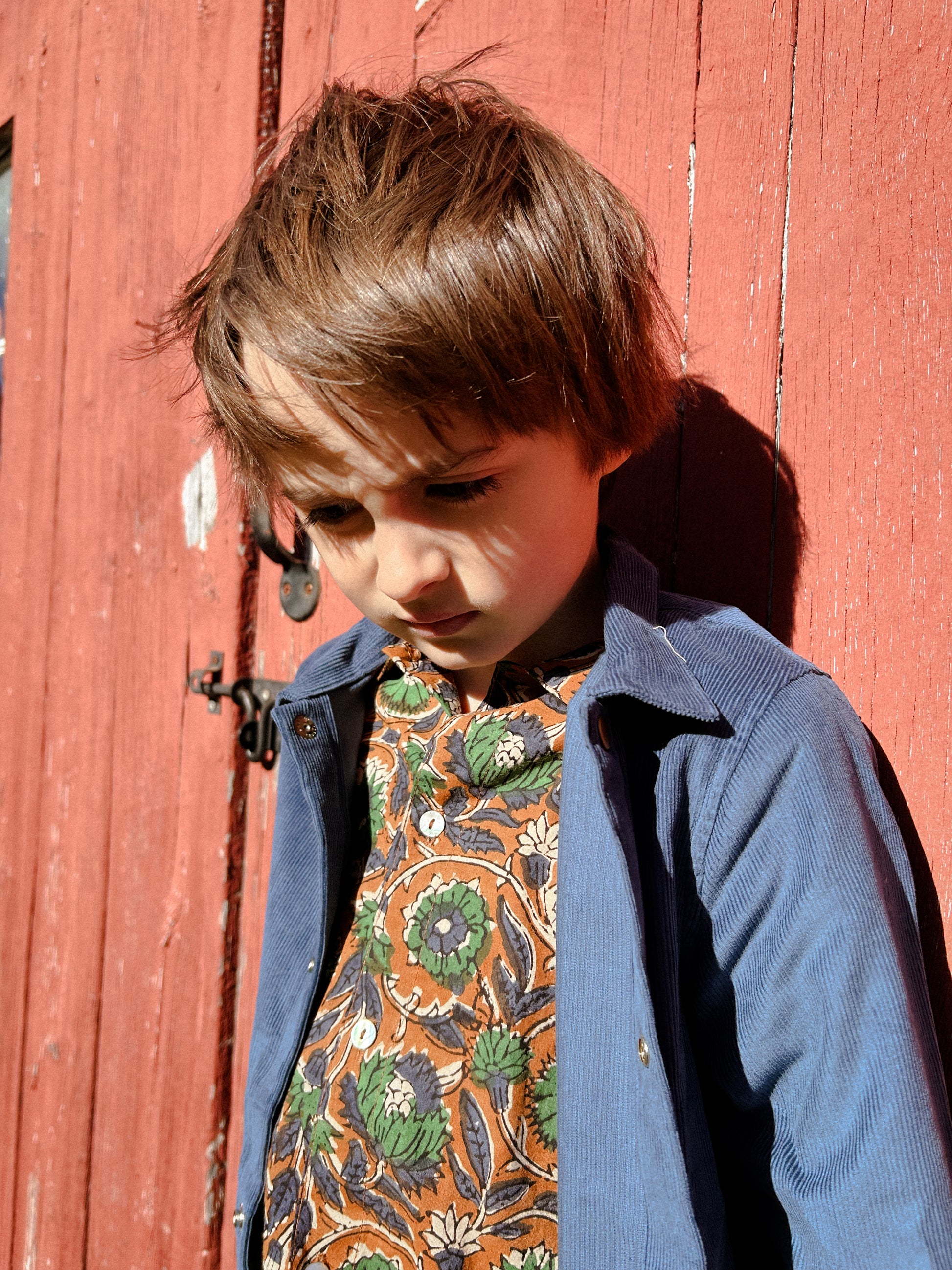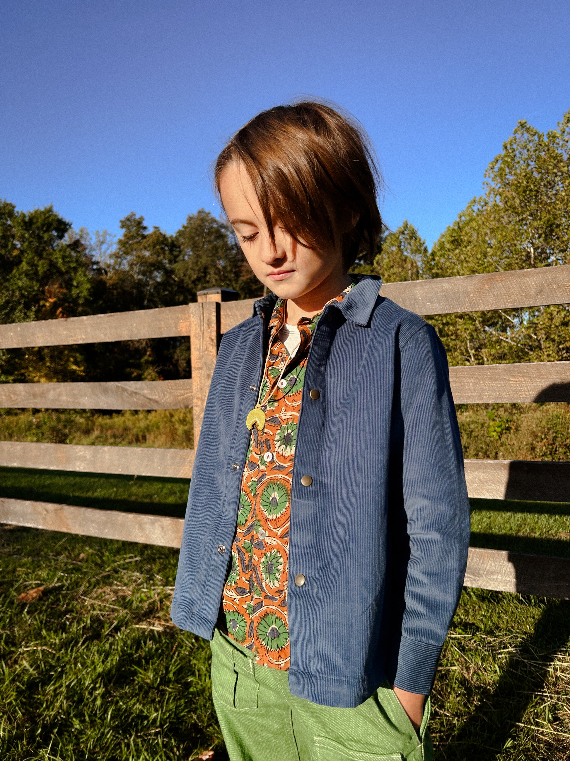 The silhouette of our beloved Hill Top with added side pockets and cut from a thick cotton 14 wale cord. Featuring an interior printed yoke, snaps down the front and at the wrists, locker loop for easy hanging. This is the perfect layer for chilly days around the house or to throw on as an extra layer under you coat on chilly days. Easy and simple utility jacket. Layer over our lighter weight Hill Top for a sweet double collar look.