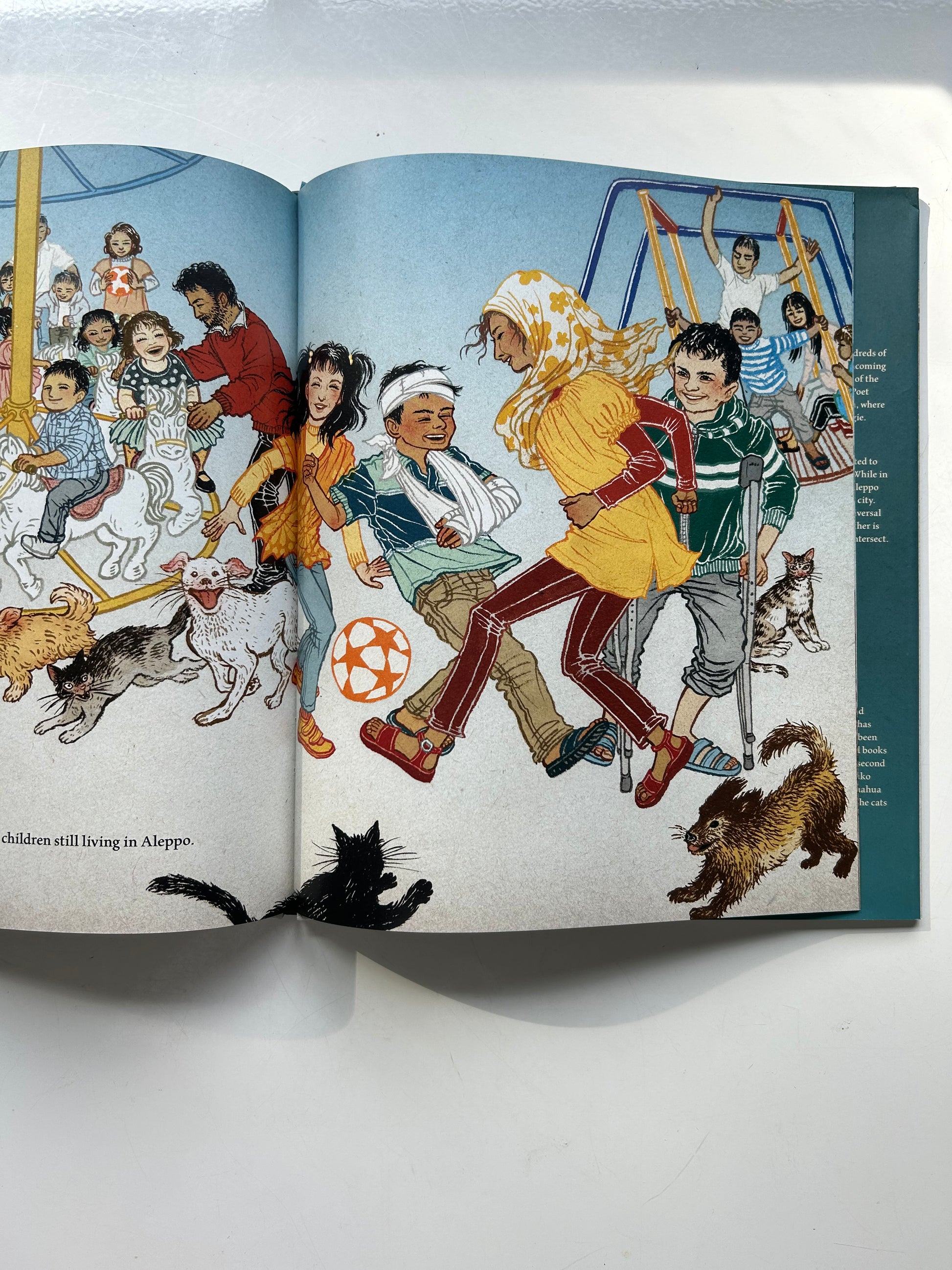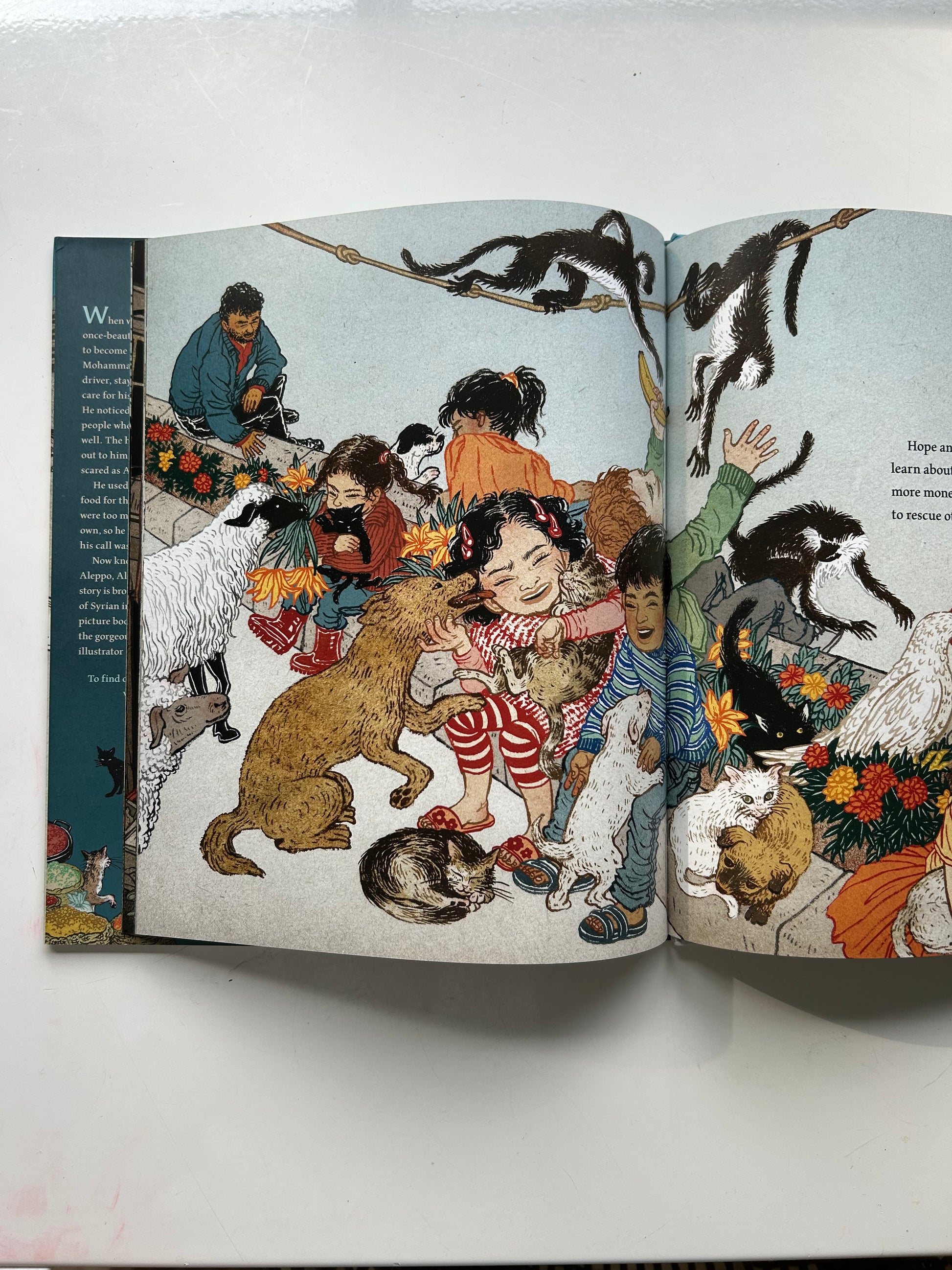 Aleppo's city center no longer echoes with the rich, exciting sounds of copper-pot pounding and traditional sword sharpening. His neighborhood is empty--except for the many cats left behind. Alaa loves Aleppo, but when war comes his neighbors flee to safety, leaving their many pets behind. Alaa decides to stay--he can make a difference by driving an ambulance, carrying the sick and wounded to safety. One day he hears hungry cats calling out to him on his way home. They are lonely and scared, just like him. He feeds and pets them to let them know they are loved. The next day more cats come, and then even more There are too many for Alaa to take care of on his own. Alaa has a big heart, but he will need help from others if he wants to keep all of his new friends safe.