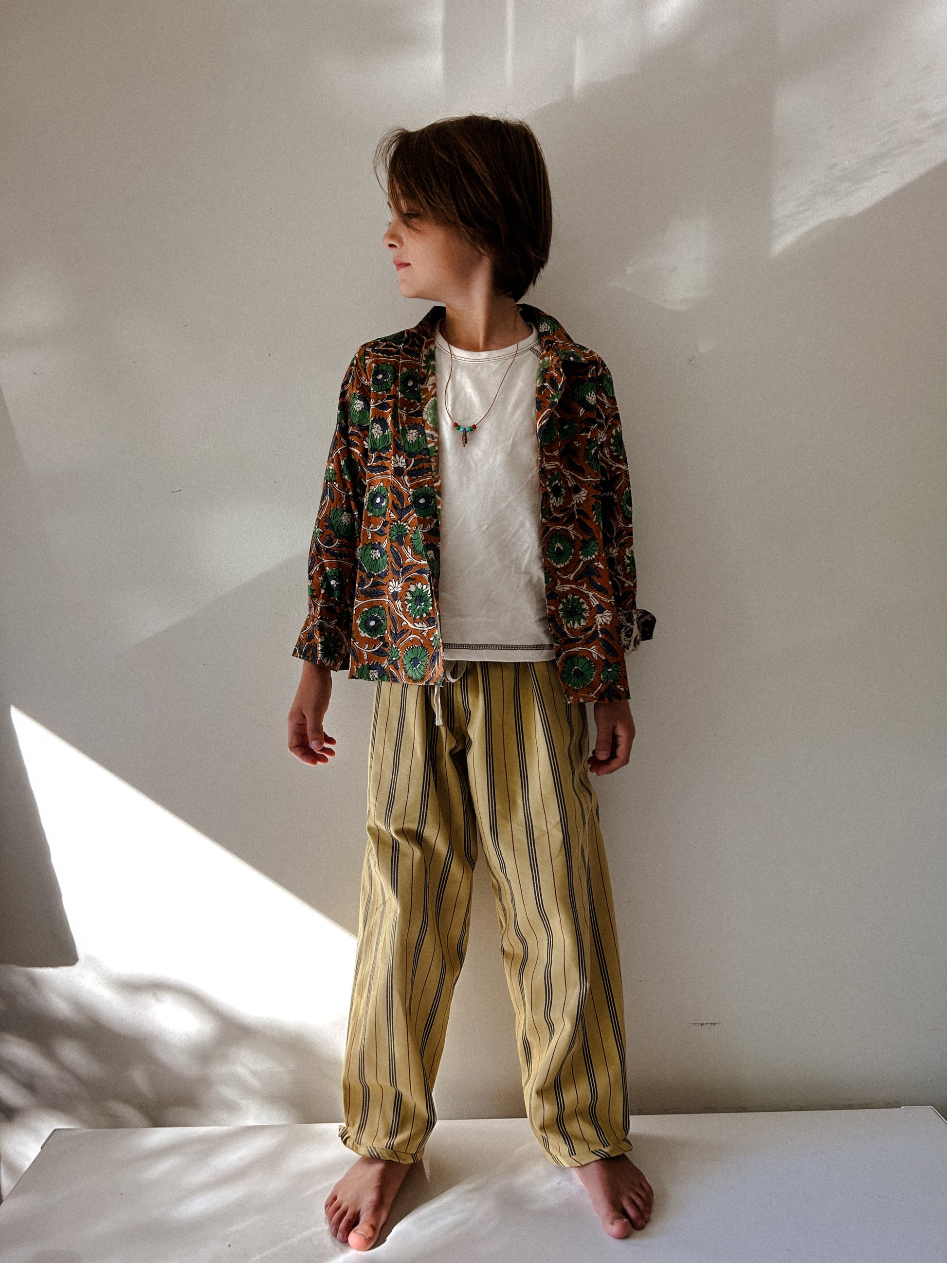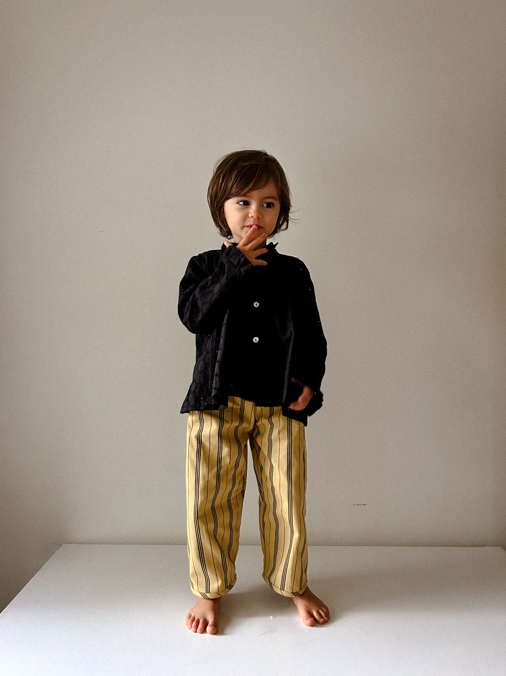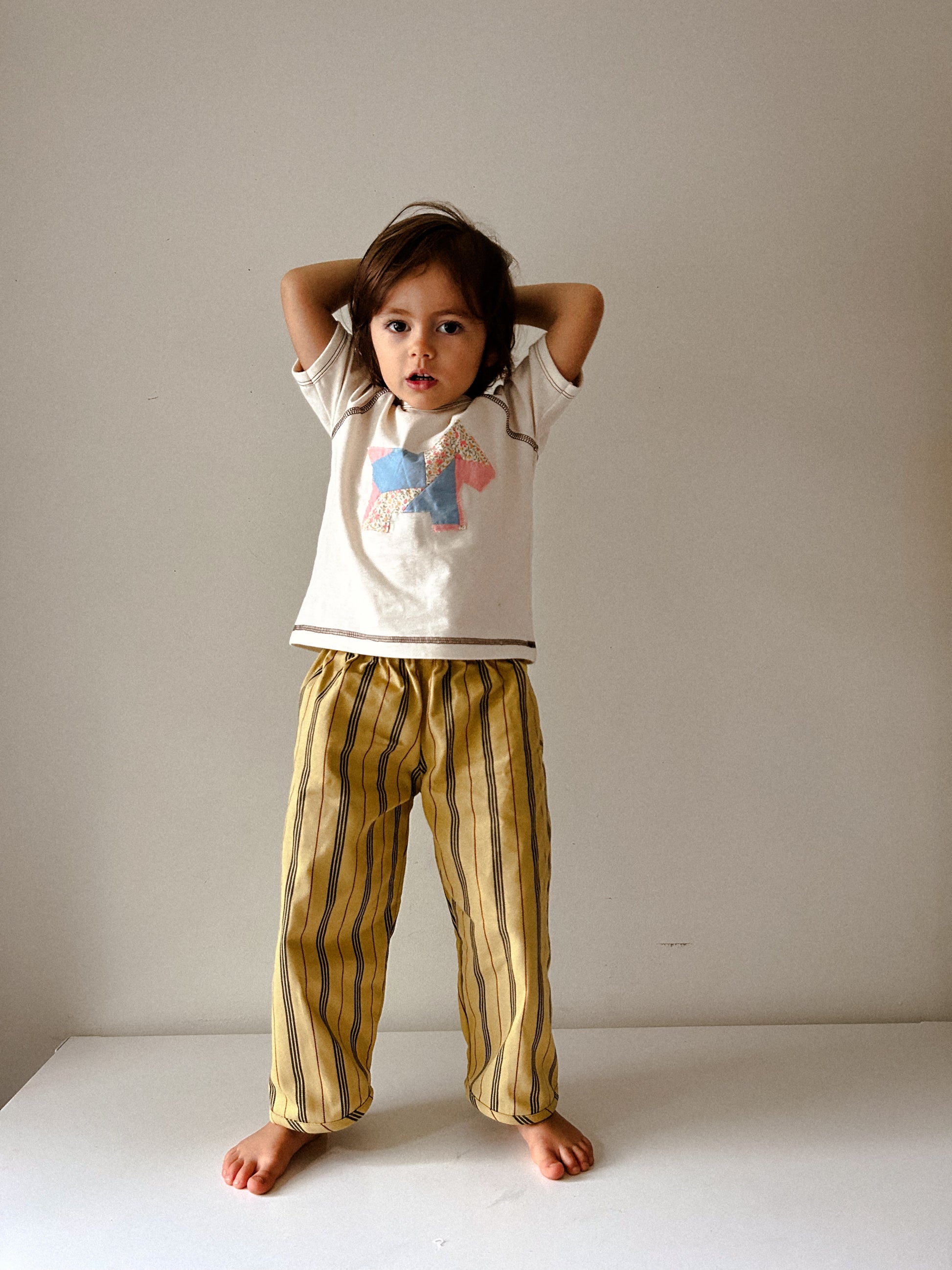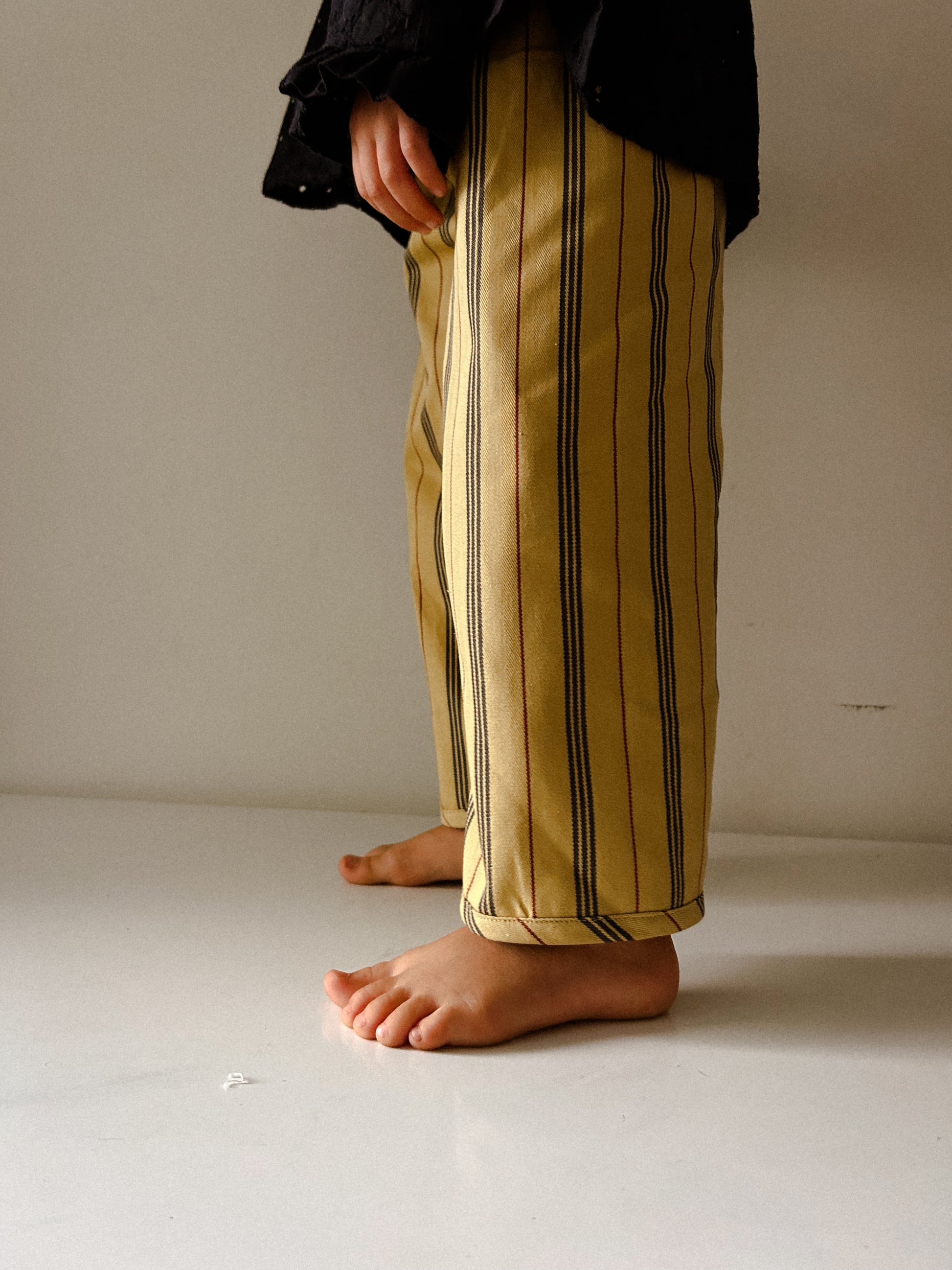An easy every day pant embracing both style and comfort. Featuring an elastic waistband, draw string and back patch pocket with a shell button closure. Roomy with a slightly tapered ankle and beautiful bound hem. Cut from ticking cloth —a heavier weight cotton that has then been overdyed a golden sunflower yellow. Dress it up, wear it to school or lounge.