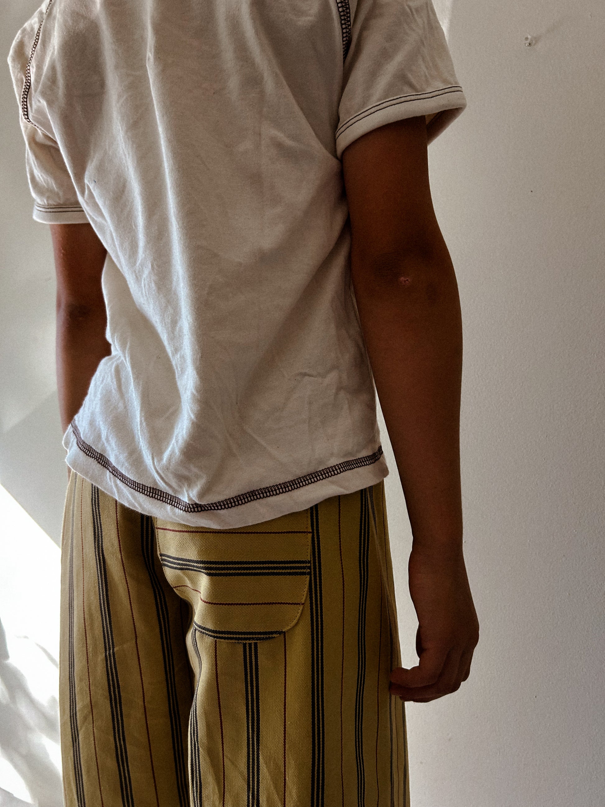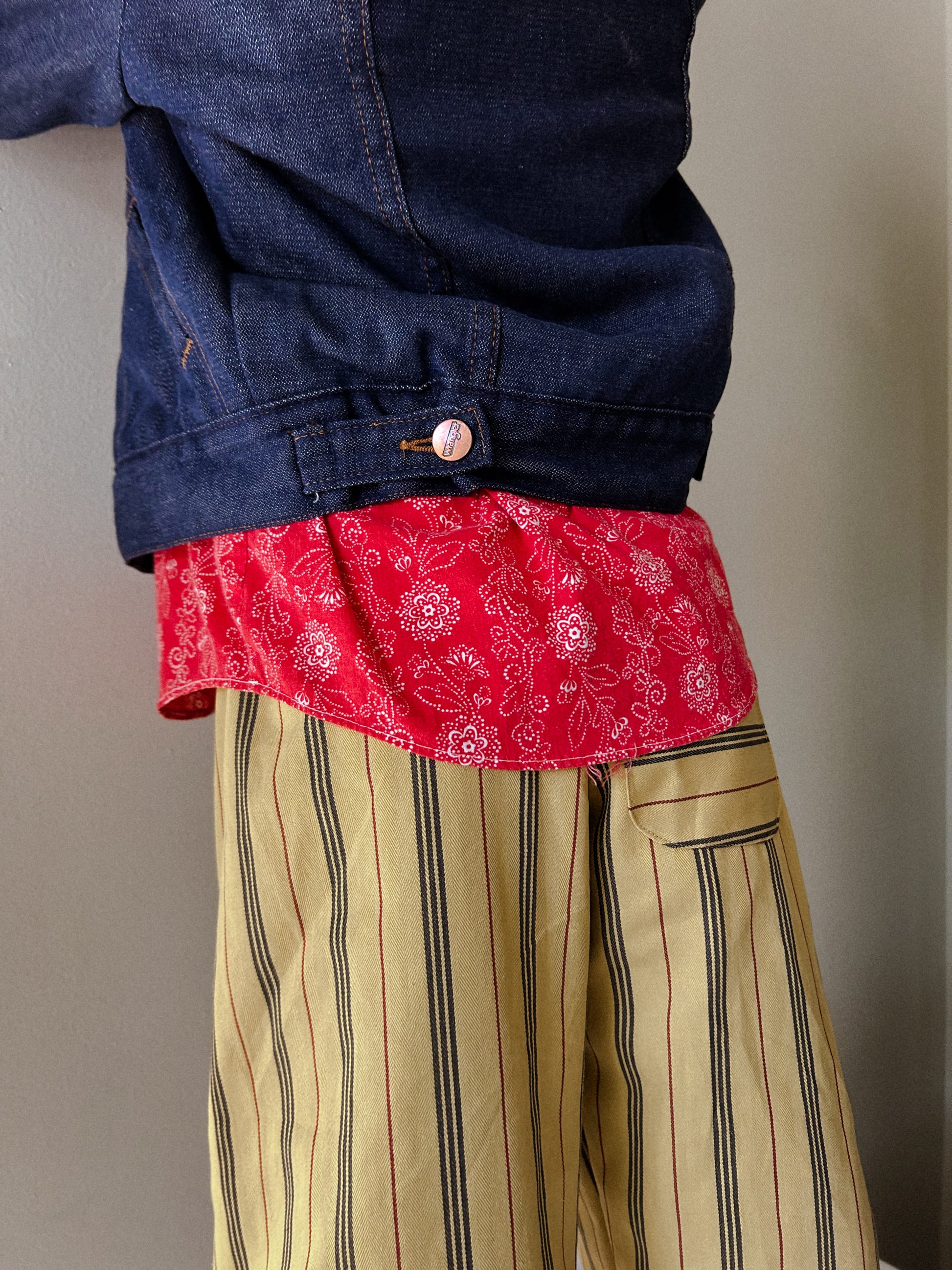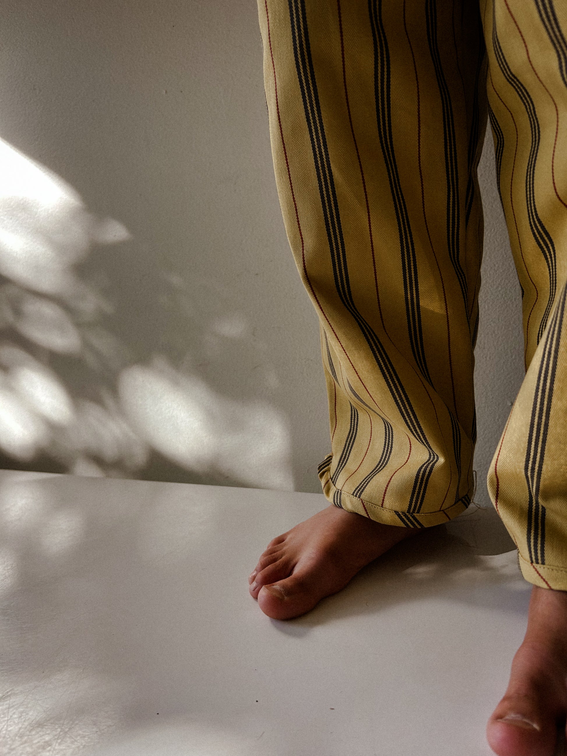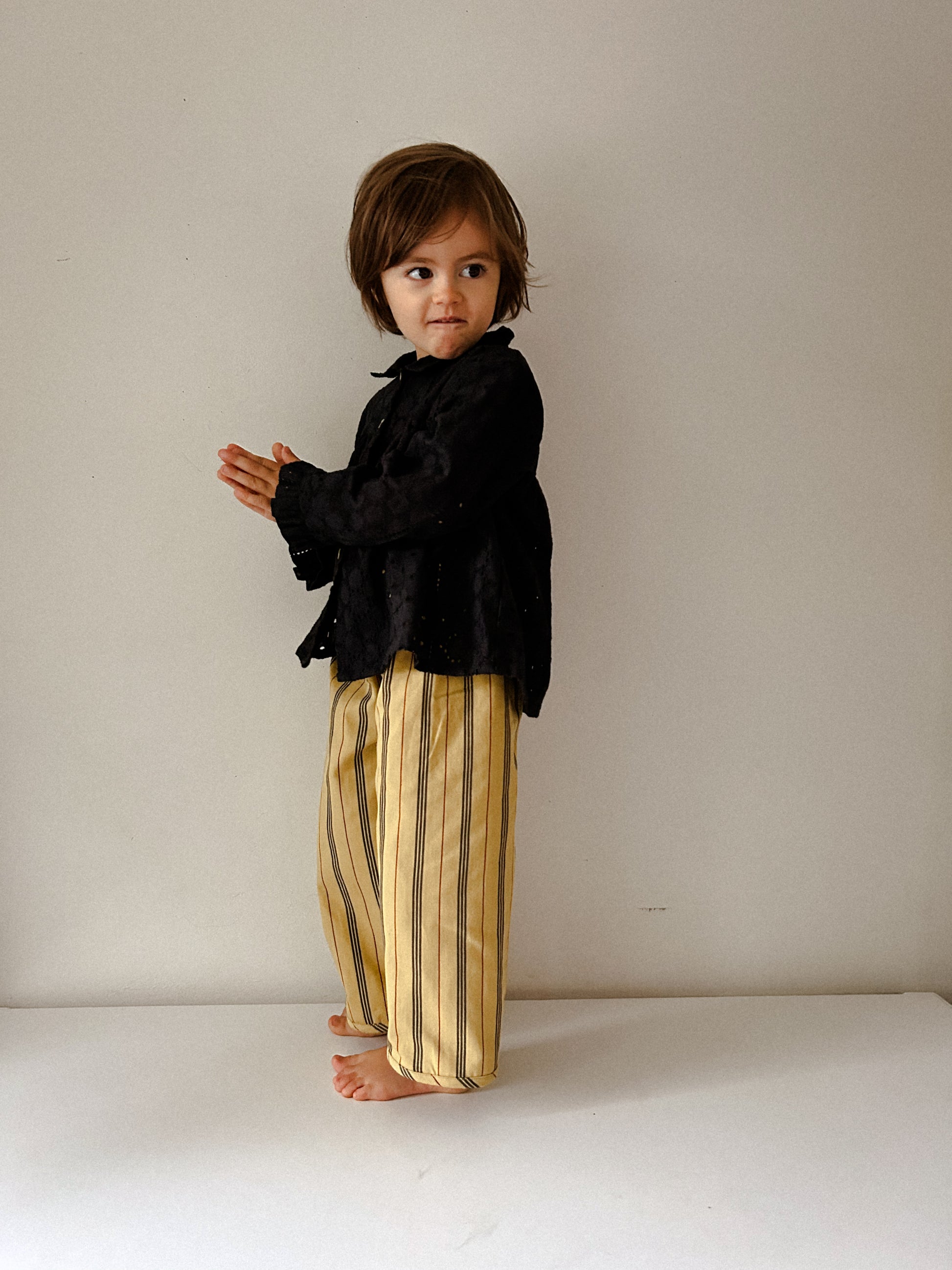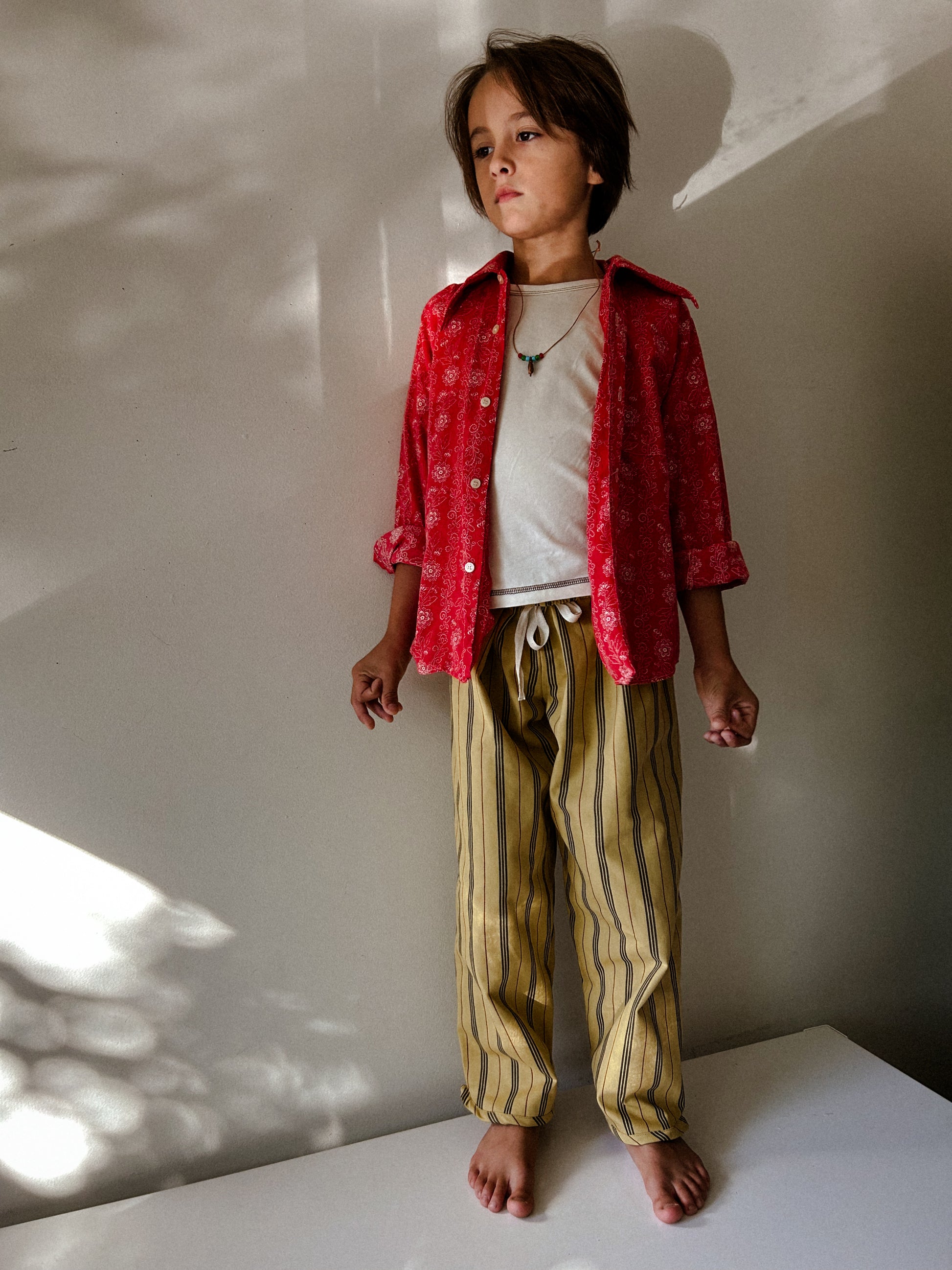 An easy every day pant embracing both style and comfort. Featuring an elastic waistband, draw string and back patch pocket with a shell button closure. Roomy with a slightly tapered ankle and beautiful bound hem. Cut from ticking cloth —a heavier weight cotton that has then been overdyed a golden sunflower yellow. Dress it up, wear it to school or lounge.