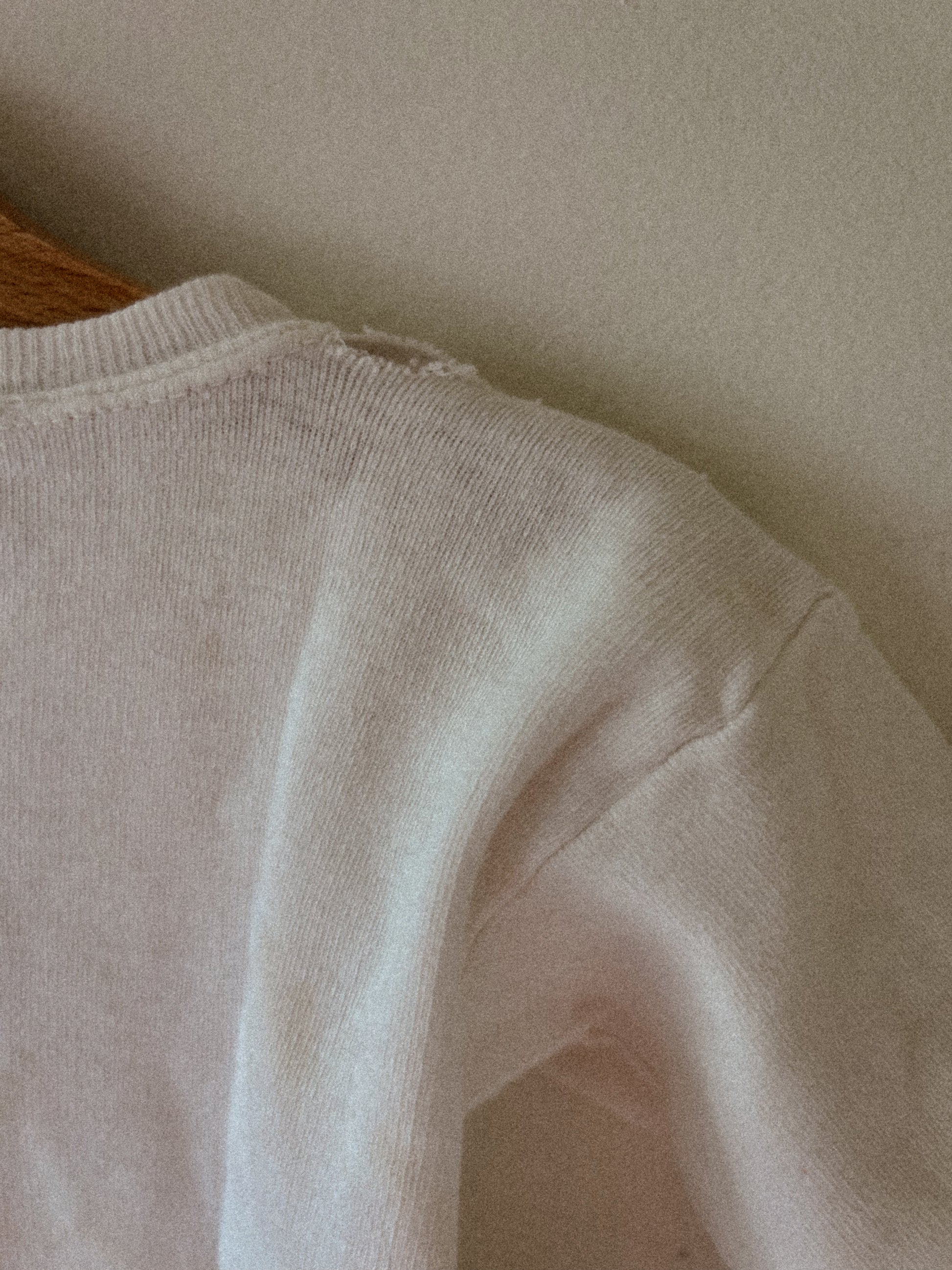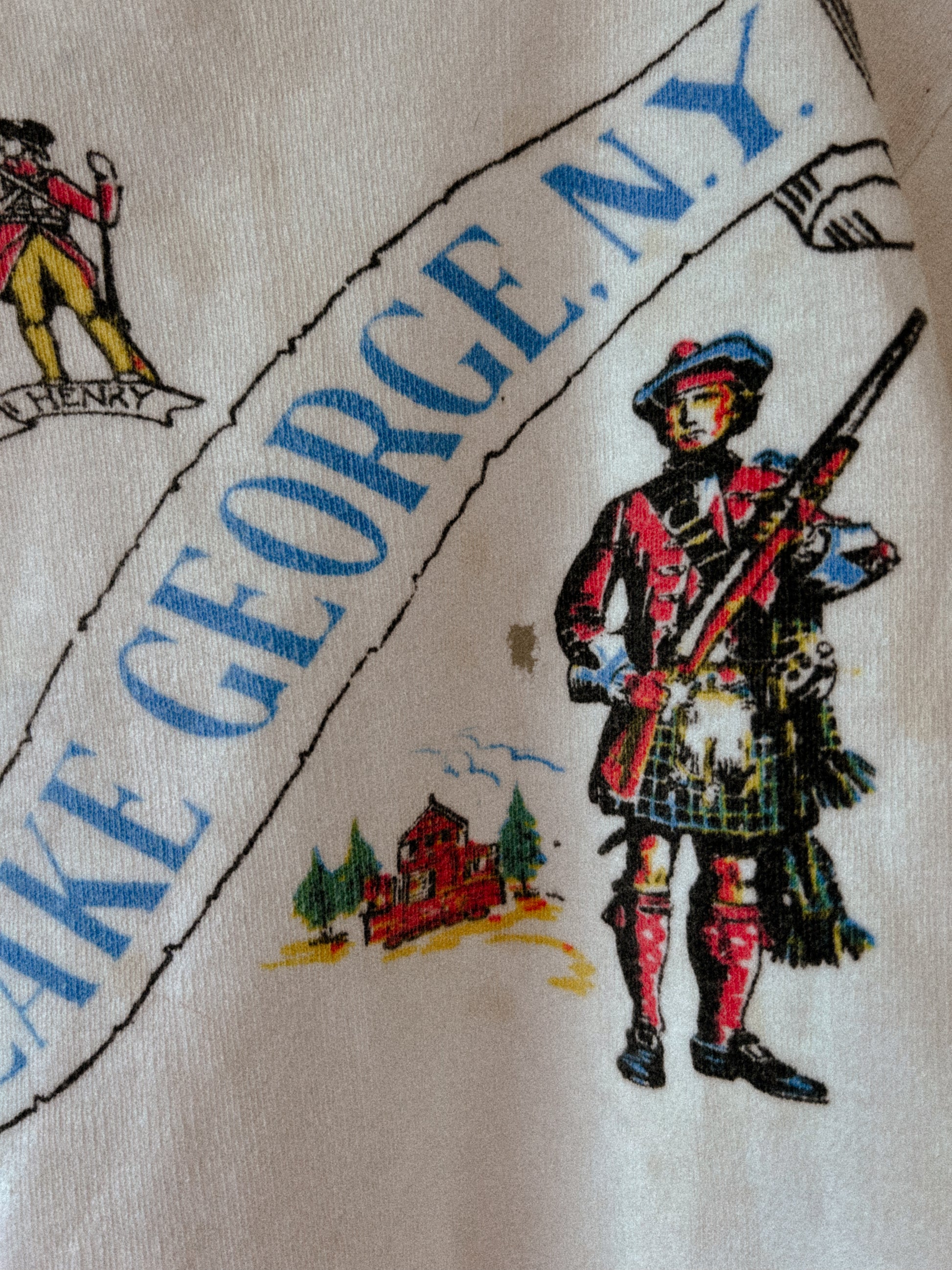 60s souvenir tee. Shows signs of wear. Holes at neckline and shoulder and tummy. Marks throughout but lots of life left. Pair with any of our pants!