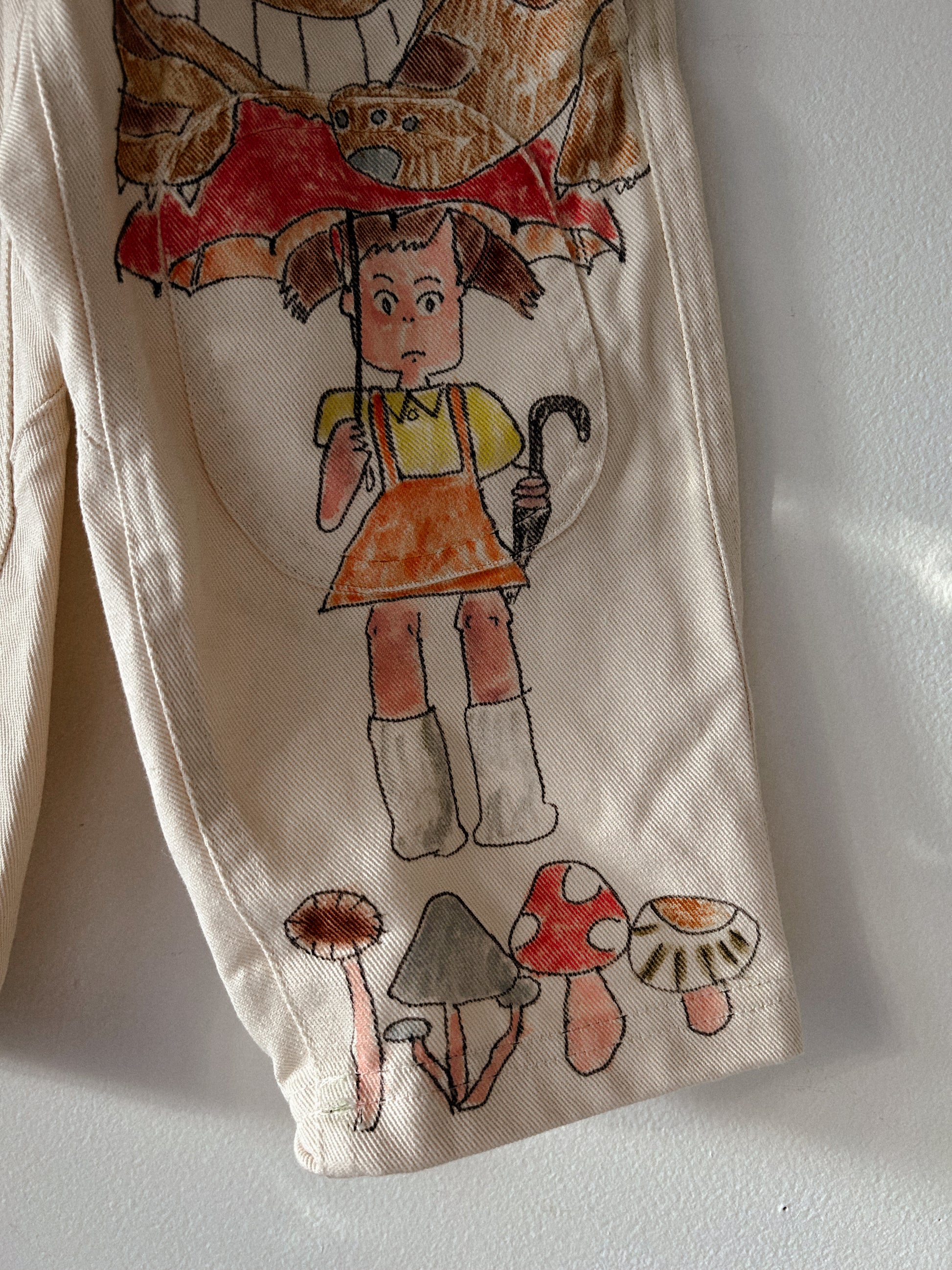 A collab featuring Sandw1tch Shop's whimsical hand drawings on our Mountain Pants with red thread! Inspired by nature, story books, and play. Katie's drawings have an immediacy and posses that undeniable need to create that comes from the core. Her drawings become an experience. Playful and open ended they give you just the beginning of a story allowing your imagination to write or draw the stories end. Hand drawn with fabric markers these drawings simply dance on our pants when worn.