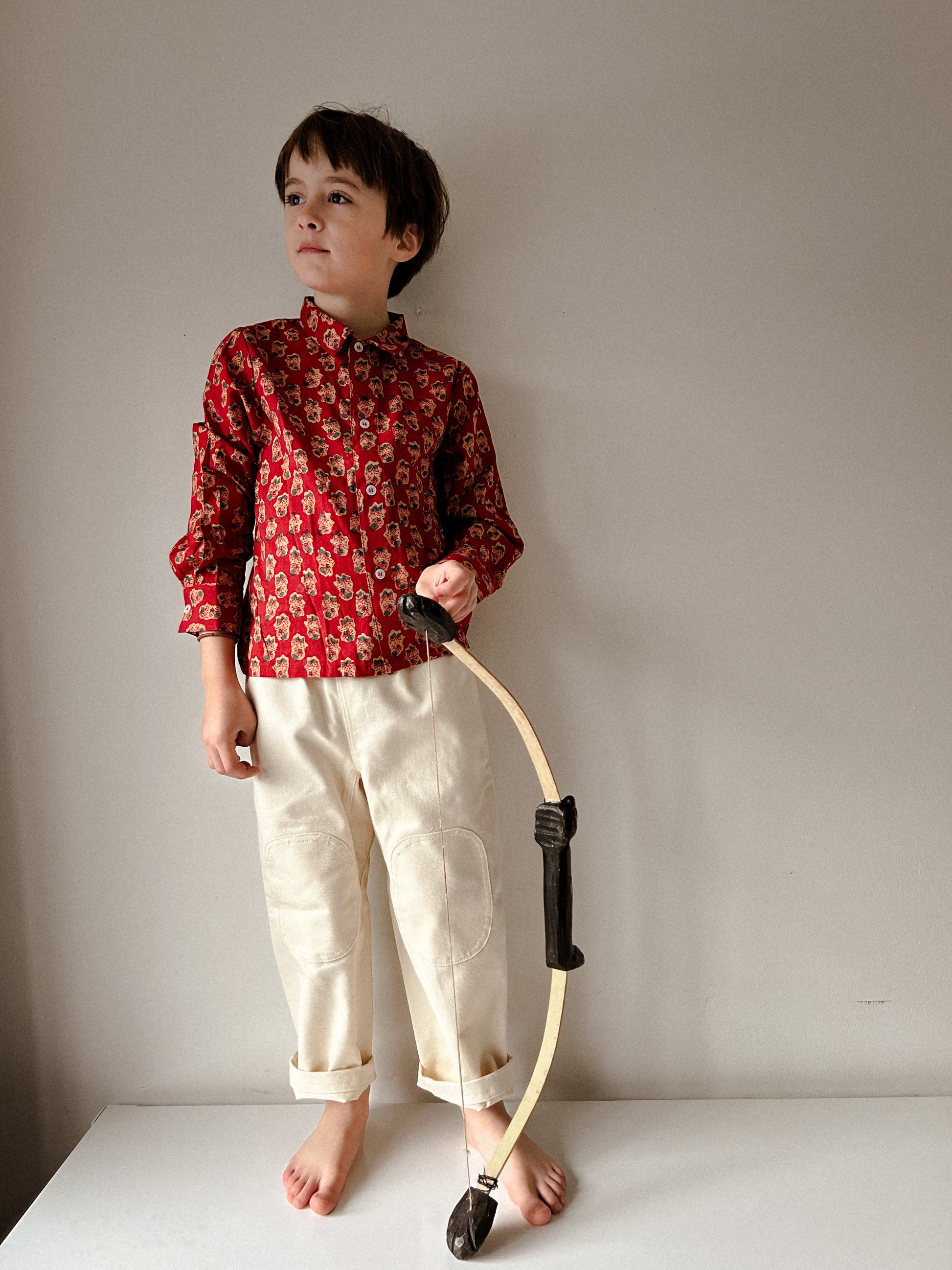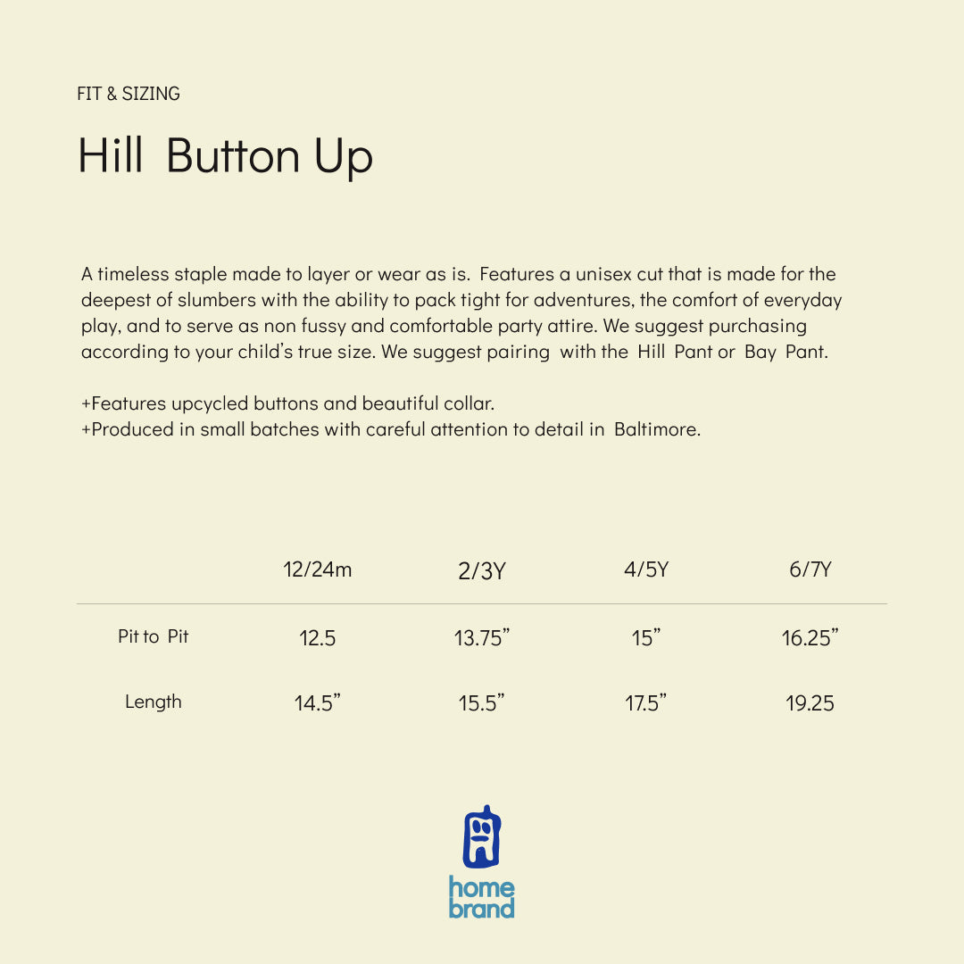Inspired by a 1960's pajama top. The Hill Top remains in our closet as a timeless staple made to layer or wear as is. Featuring a unisex cut that is made for the deepest of slumbers with the ability to pack tight for adventures, the comfort of everyday play, and to serve as non fussy and comfortable party attire. We suggest purchasing according to your child’s true size. We suggest pairing with the Hill Pant or Bay Pant.